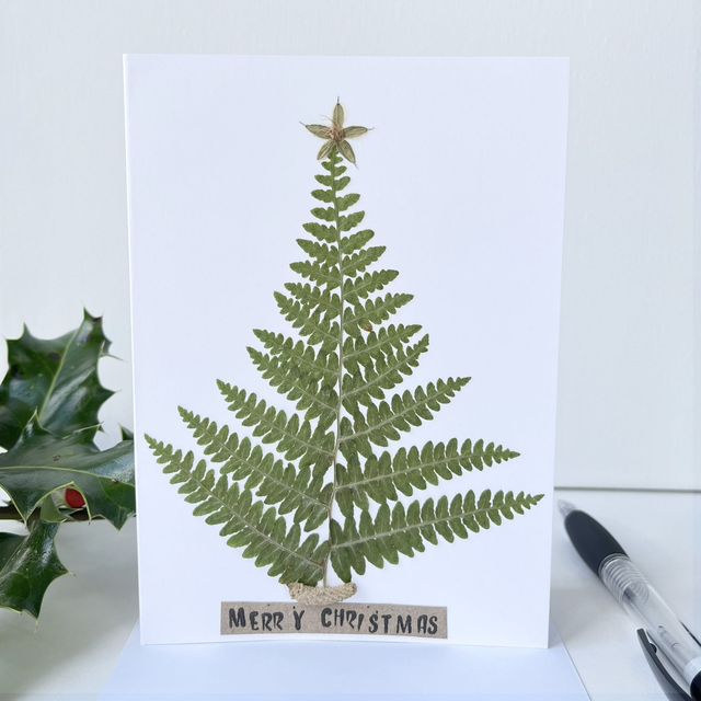 A hand pressed fern leaf Christmas tree with a hand pressed catkin stand and topped with a hand pressed geranium sepal star. Displayed on a white kraft A6 (10.5 × 14.8 cm) greeting card.