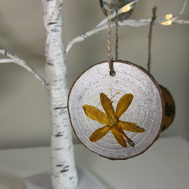 Hand painted wood slices and decorated with traditionally slow pressed crocosmia and finished with a bit of biodegradable glitter. Wood slices are between 7-8cm in diameter.